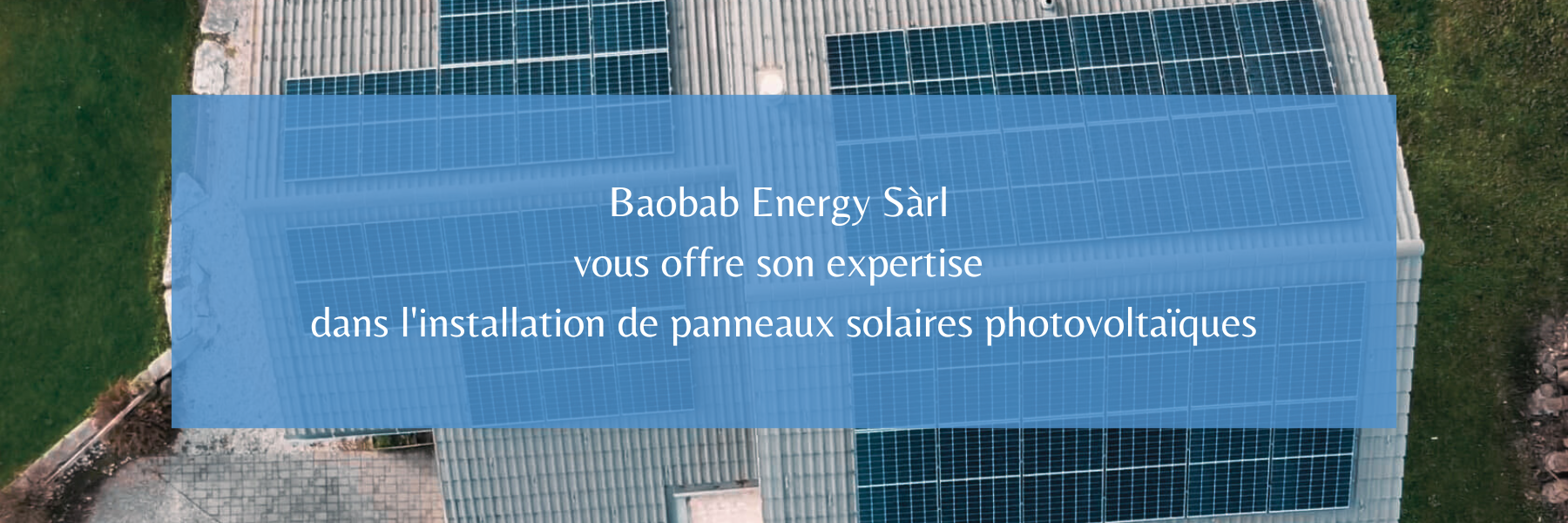 Baobab Energy Sàrl, active dans le domaine du solaire photovoltaïque, offre une variété de services pour permettre aux particuliers, aux entreprises et aux collectivités de profiter des avantages de cette source d'énergie renouvelable. Voici quelques prestations non-exhaustives offertes par Baobab Energy: